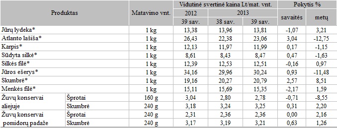 Žuvų vidutinės mažmeninės kainos Lietuvoje 2012 m. 39 sav. - 2013 m. 39 sav.