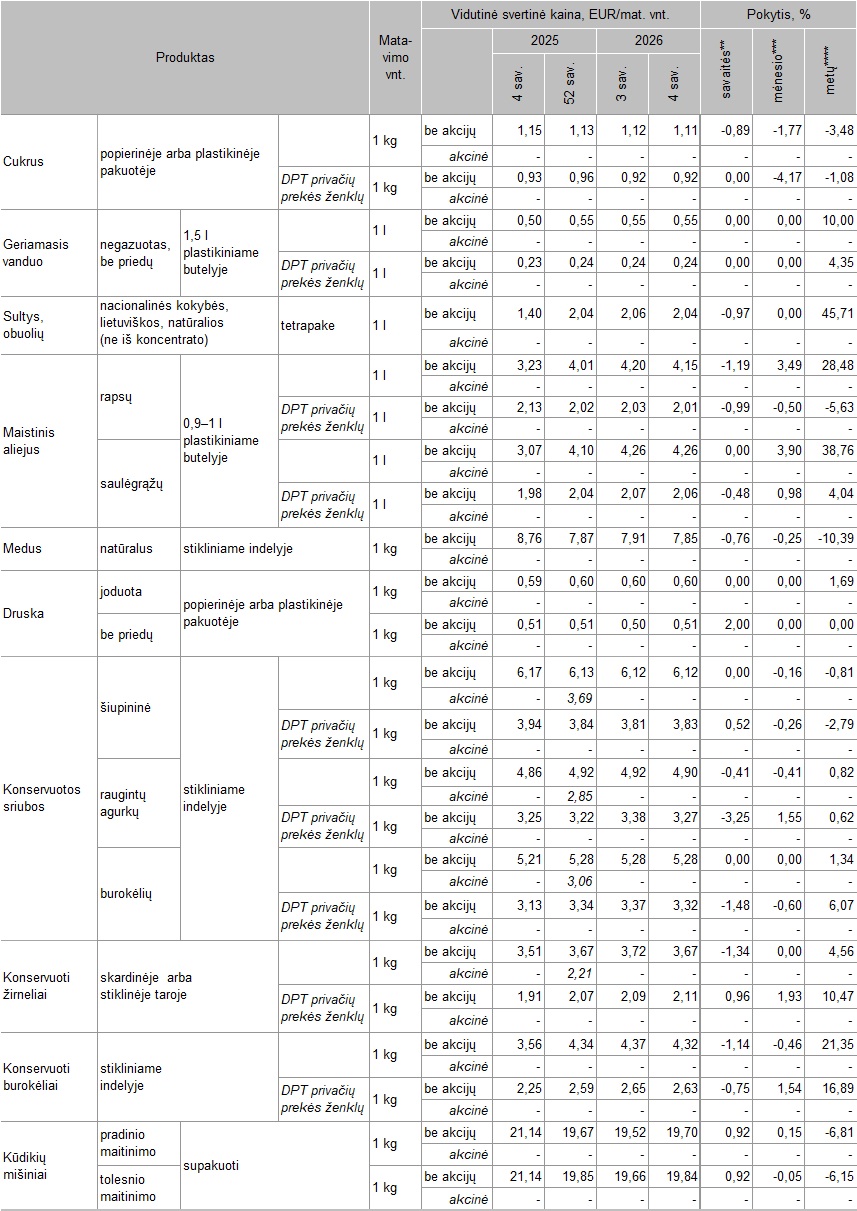 * kainos registruojamos Vilniaus, Kauno, Klaipėdos, Panevėžio ir Marijampolės miestų UAB „Lidl Lietuva“, UAB „Maxima LT“, UAB „Norfos mažmena“, UAB „IKI Lietuva“ ir UAB „Rimi Lietuva“ prekybos tinklų parduotuvėse