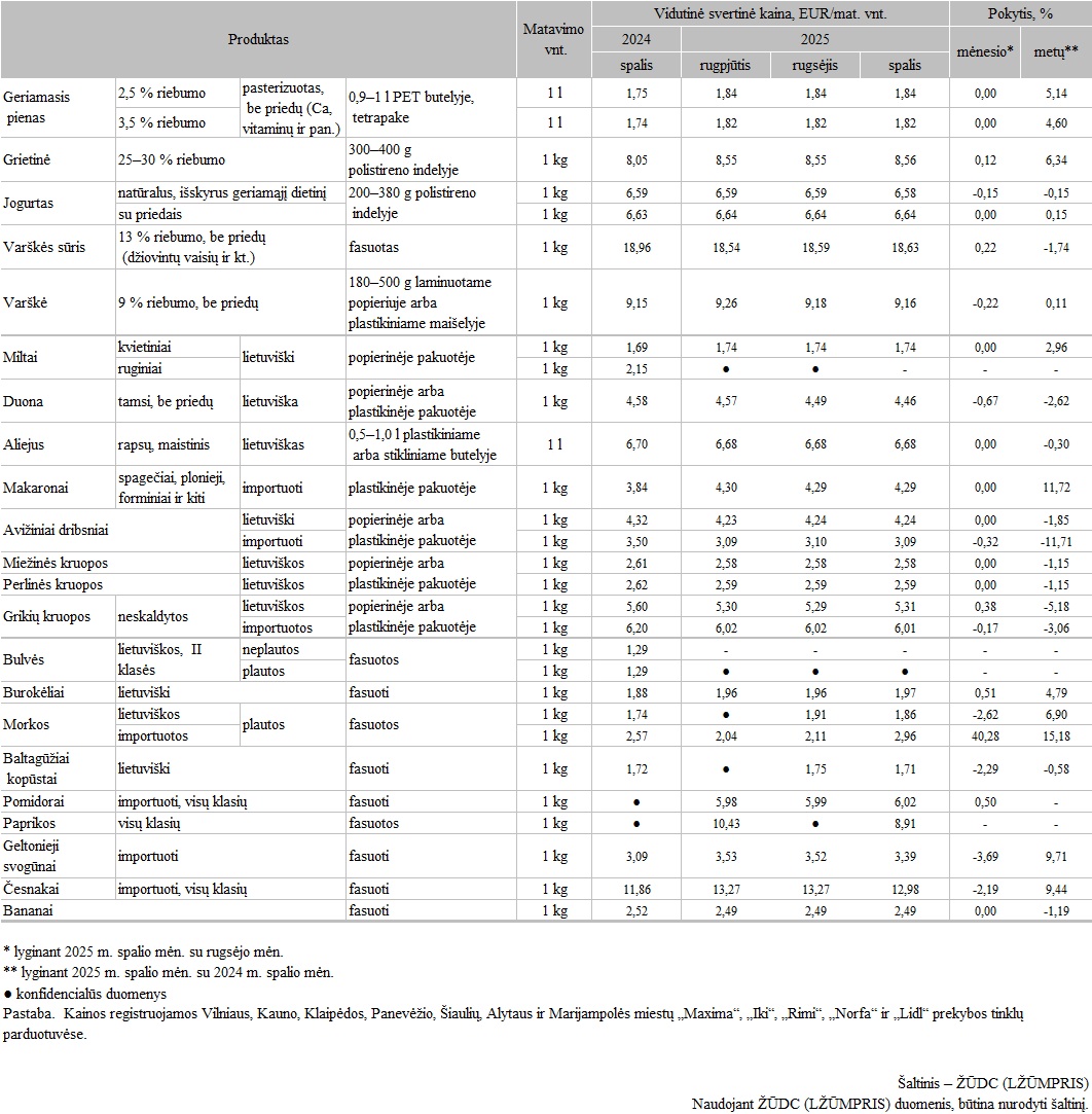 | 2025-11-04 - Ekologiškų maisto produktų vidutinės mažmeninės kainos Lietuvos prekybos tinklų parduotuvėse 2024–2025 m. spalio mėn., EUR/mat. vnt. |
