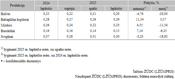 | Bulvių ir daržovių supirkimo iš Lietuvos augintojų perdirbimui kainos 2025 m. rugsėjo–lapkričio mėn., EUR/kg (be PVM) |