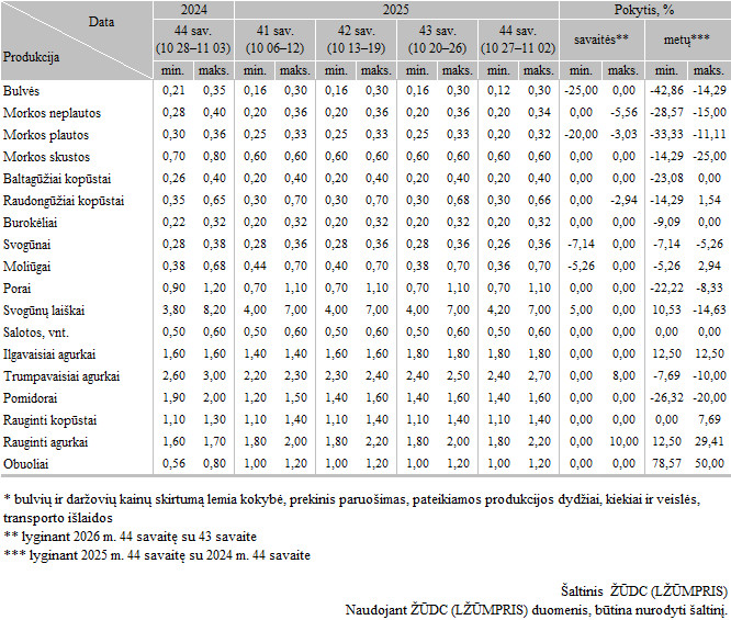 | Bulvių, daržovių ir obuolių vidutinės pardavimo kainos Lietuvos prekiniuose ūkiuose ir šiltnamiuose 2025 m. (41–44 sav.), EUR/kg (be PVM)* |