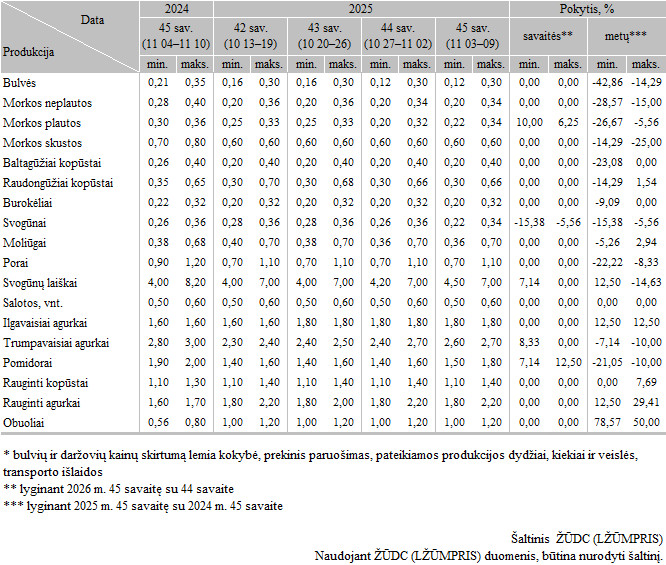 | Bulvių, daržovių ir obuolių vidutinės pardavimo kainos Lietuvos prekiniuose ūkiuose ir šiltnamiuose 2025 m. (42–45 sav.), EUR/kg (be PVM)* |