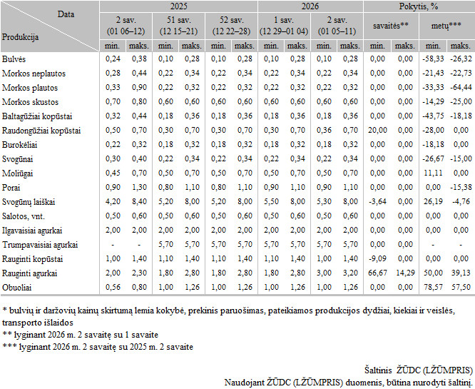 | Bulvių, daržovių ir obuolių vidutinės pardavimo kainos Lietuvos prekiniuose ūkiuose ir šiltnamiuose 2025 m. (51–52 sav.)–2026 m. (1–2 sav.), EUR/kg (be PVM)* |