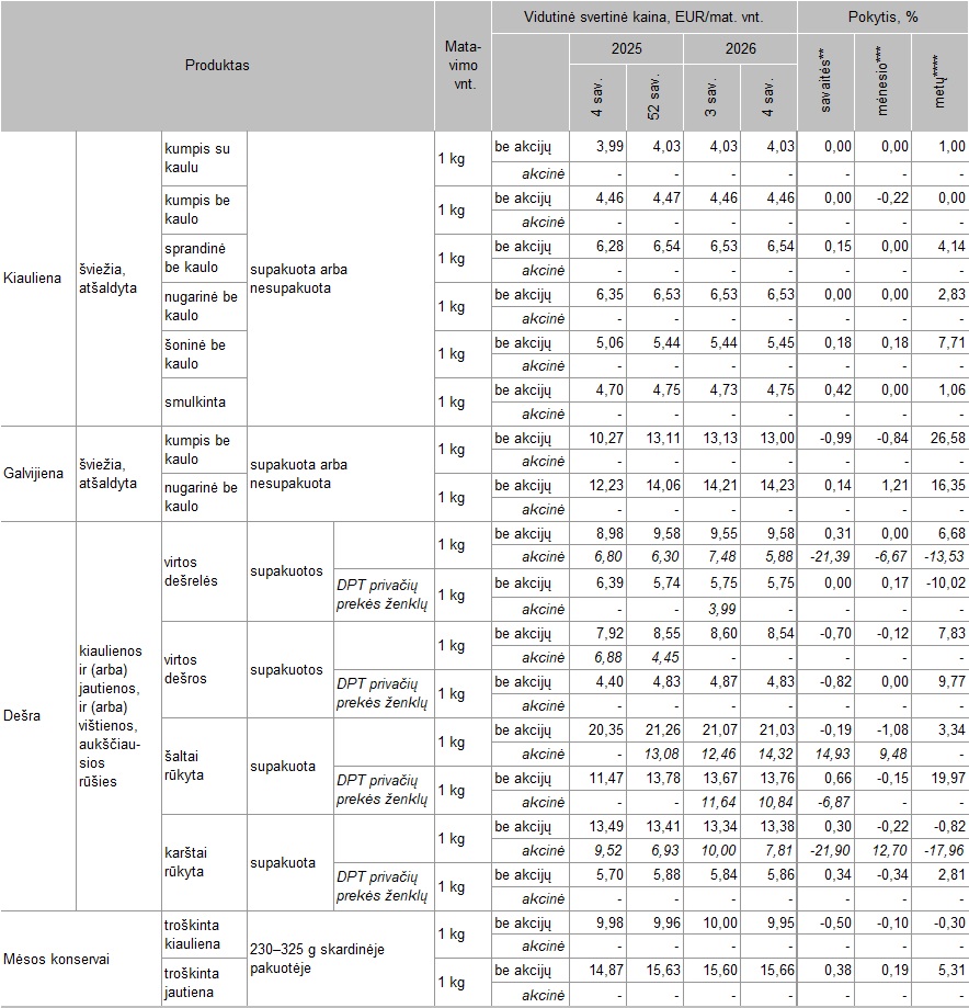 2026-01-26 - Mėsos produktų vidutinės mažmeninės kainos Lietuvos didžiųjų prekybos tinklų (DPT) parduotuvėse* 2025–2026 m. 4 sav.
