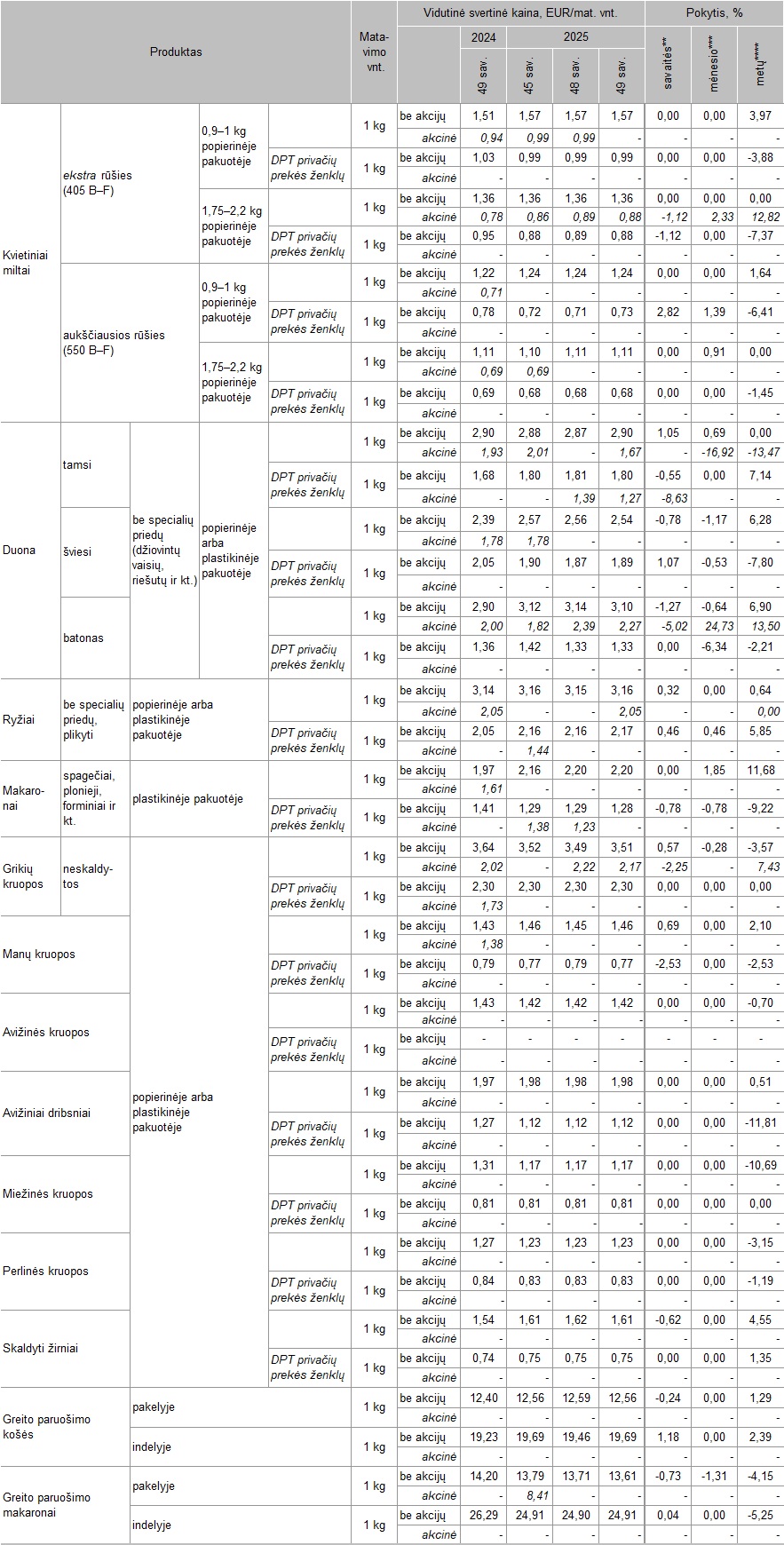 * kainos registruojamos Vilniaus, Kauno, Šiaulių, Panevėžio ir Alytaus miestų UAB „Lidl Lietuva“, UAB „Maxima LT“, UAB „Norfos mažmena“, UAB „IKI Lietuva“ ir UAB „Rimi Lietuva“ prekybos tinklų parduotuvėse