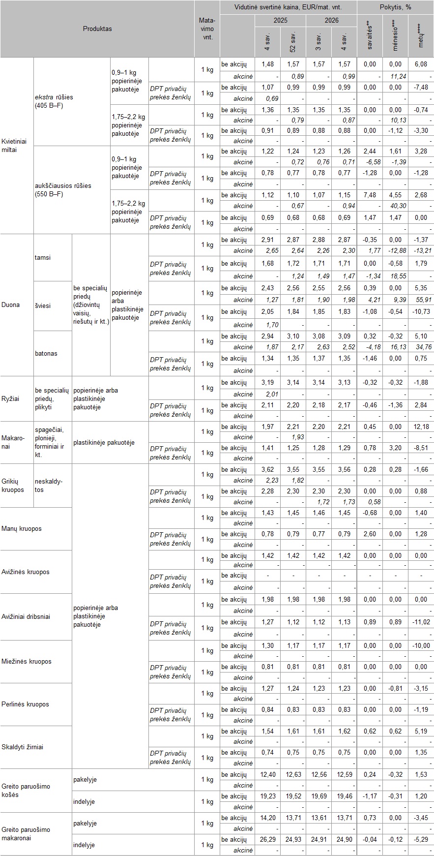 2026-01-26 - Grūdų produktų vidutinės mažmeninės kainos Lietuvos didžiųjų prekybos tinklų (DPT) parduotuvėse* 2025–2026 m. 4 sav.