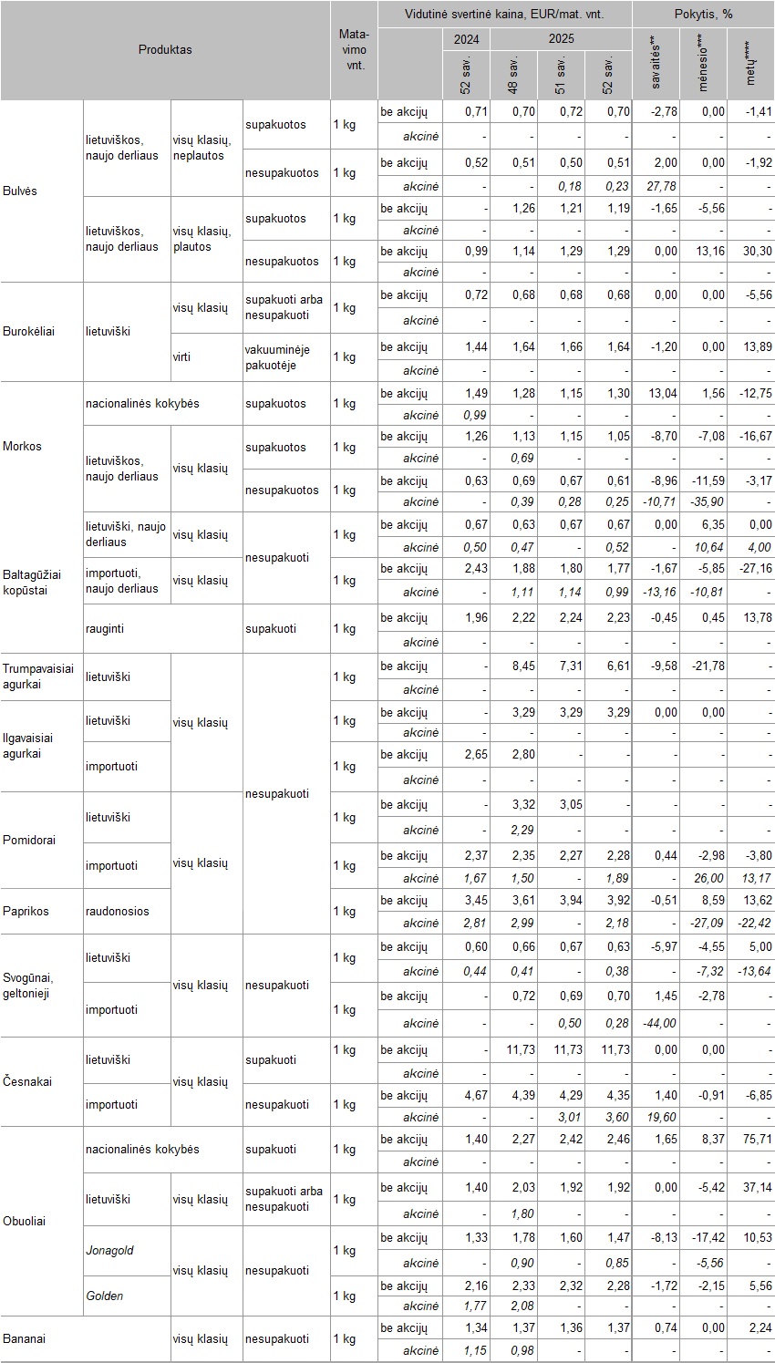 | 2025-12-29 - Bulvių, daržovių ir vaisių vidutinės mažmeninės kainos Lietuvos didžiųjų prekybos tinklų parduotuvėse* 2024–2025 m. 52 sav. |