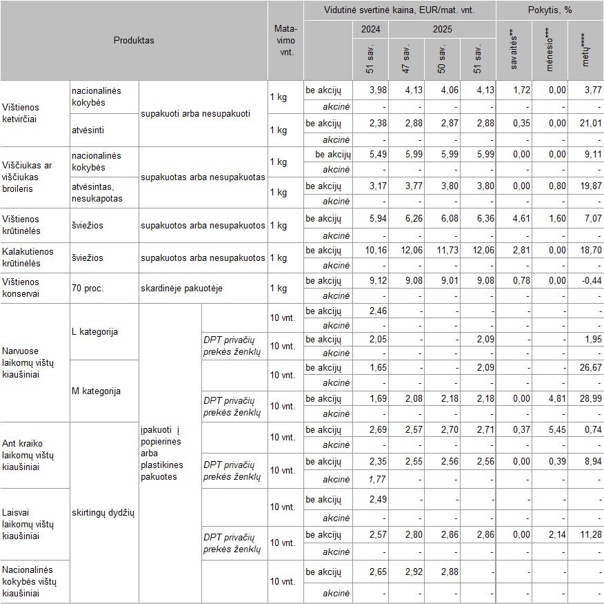 2025-12-22 - Paukštienos produktų ir kiaušinių vidutinės mažmeninės kainos Lietuvos didžiųjų prekybos tinklų (DPT) parduotuvėse* 2024–2025 m. 51 sav.